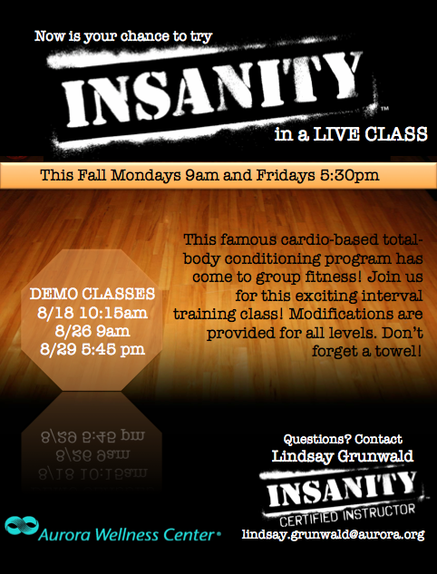 I'm super excited to announce that I will be leading INSANITY classes at the Aurora Wellness Center beginning this fall! Here are the details: